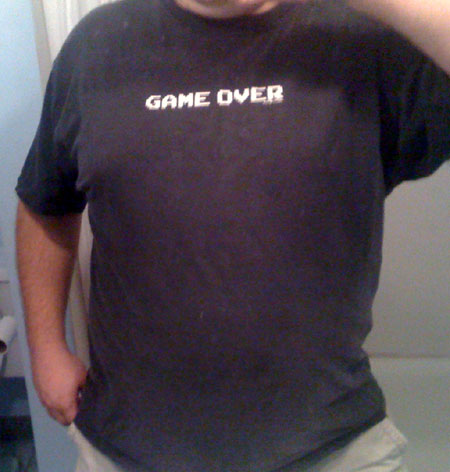 Yes, the words "GAME OVER" are printed in a large, pixelated font destined to remind classic gamers of their favorite Atari or original NES games. And then, it also says (in standard white text) the creators of the shirt: thinkgeek.com, the central place for all products geeky and cool.