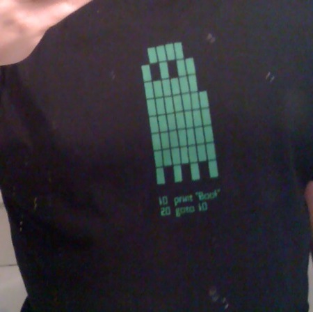 For those who are not so well-versed in the Homestar Runner canon, the Bad Graphics Ghost first appeared in sbemail 48, where Strong Bad's old Apple II-style computer haunts him. The ghost is replicated in beautiful blocks on the front of this shirt, with an amazingly simple BASIC program below it: